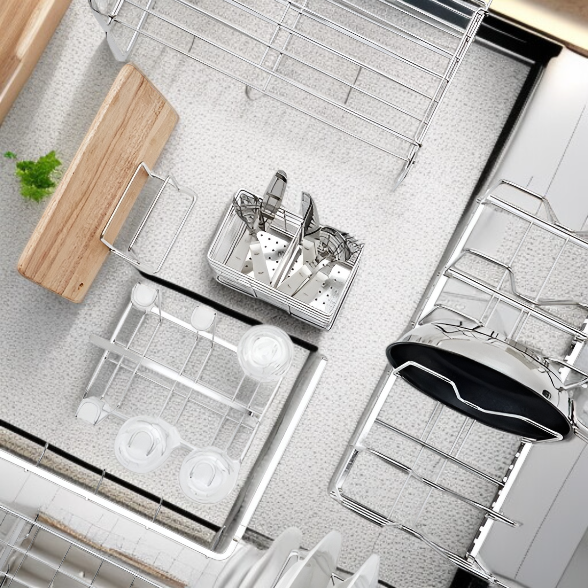 ● Zestaw 14 praktycznych akcesoriów, takich jak stojak na talerze, organizator na przyprawy czy wieszak na ręczniki kuchenne, pomaga utrzymać idealny porządek i maksymalnie wykorzystać przestrzeń w zlewie oraz na blacie.